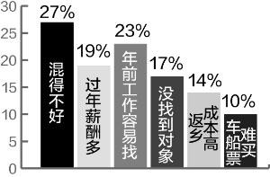 打工者们为什么过年不选择回家?调查显示,“混得不好”是主要因素。27%的受访者认为,自己在外面混得不好,不好意思回家。