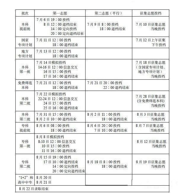 8月8日至11日:专科第一批院校录取。参加本批次录取的院校包括:普通本科院校高职(专科);普通高等专科学校;经批准参加本批录取的国家示范和骨干高等职业院校和专业;本批录取院校的民族专科预科;本批招收藏文、彝文一类模式专科层次免费师范生院校及招收一类模式考生的藏文、彝文专科专业的院校。