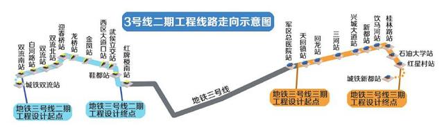 三期工程(北延线)连接新都,起于一期工程终点,沿川陕公路、大件路、蓉都大道及新都大道走行,终于红星村站,线路全长12.6km,其中高架及过渡段长5.7km,地下段长6.9km,拟设车站9座(高架站3座,地下站6座),设主变电所1座。