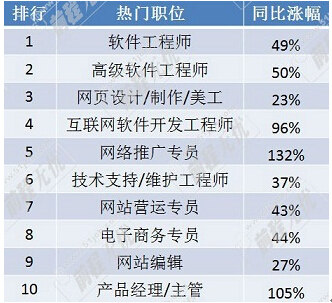 根据前程无忧《2014年第四季度雇主招聘意愿调查报告》显示,企业对成熟人才的招聘需求比三季度的调查结果增加了10个百分点,同时对中层管理人员的需求增加了4.2个百分点。无独有偶,在上述表中,产品经理/主管这一职位的网上发布职位数超过1万个,同比涨幅105%,闯入全国IT类十大热门职位排行榜的榜单。