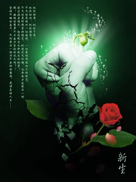 深色的背景,鲜艳的玫瑰,紧握的拳头,配上破土而出的小草,代表着新的人生,心得道路,我们紧握拳头,迎难而上,主体立意深刻,布局合理。