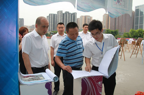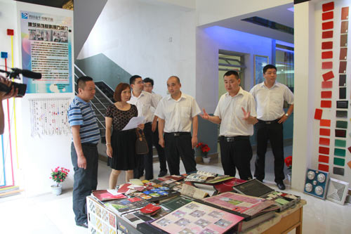 王助理为杜处长一行领导介绍样板间材料陈列室