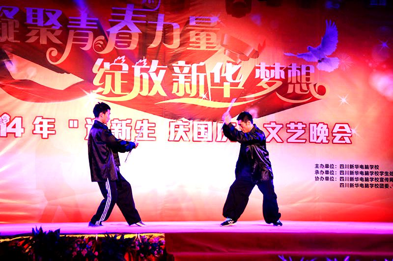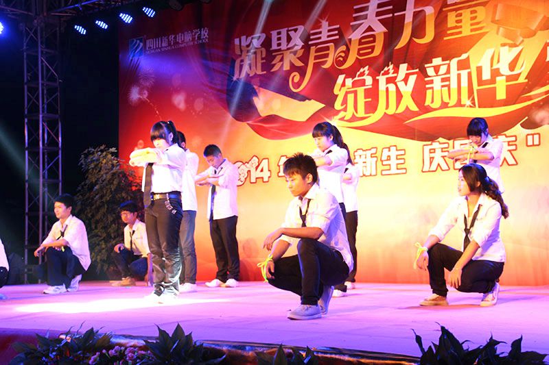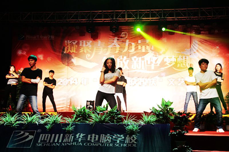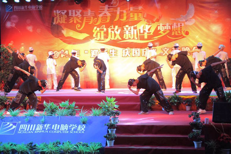 伴随着青春洋溢的开场舞《欢聚一堂》,2014“庆国庆·迎新生”文艺晚会正式拉开帷幕。晚会的节目多种多样,有天籁般的歌唱、优美优雅的民族舞、动感青春的街舞、幽默搞笑的小品、孔武有力的武术表演等等,伴随着音乐的节奏,灯光的闪烁,现场观众欢快的呐喊一浪高过一浪。新华师生们此时此刻在舞台上展现出了多才多艺的一面,丰富了校园文化氛围,点缀了夜幕下的四川新华电脑学院。