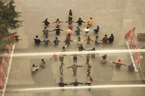 新颖的比赛形式也燃起了所有在场同学的热情,在6名参赛选手专注于设计其他文字的同时,两个班级的班主任则紧张地组织着其他学生完成拼字。15分钟的人体拼字限时略显紧张,可以看到同学和老师们在积极地献言献策或组织协调。最后,14级艺术二班的同学率先完成了“青”字的组拼,并将照片传给了他们的3位参赛选手。