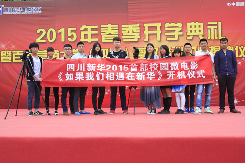 四川新华电脑学院校园微电影《如果我们相遇在新华》演员海选在历时一个多月后终于尘埃落定,4月21日,这部筹备已久的微电影正式开机,全体剧组成员一起举行了开机仪式。 《如果我们相遇在新华》举行开机仪式 各位主演合影(左起分别为:袁思敏、陈鑫、陈雪...
