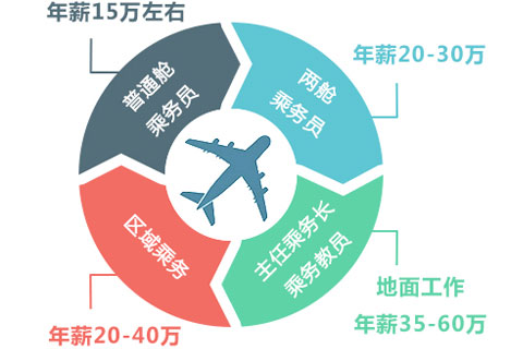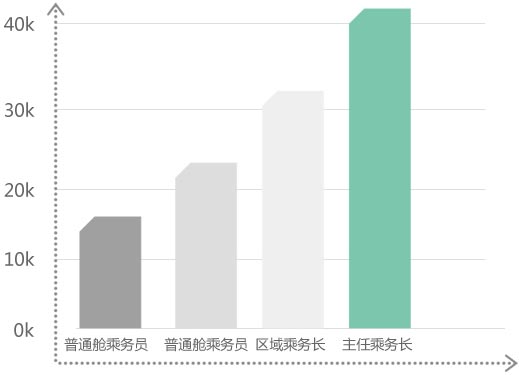 职位晋升通道:普通舱—乘务舱—两舱乘务员—区域乘务长—主任乘务长,薪资也随之水涨船高